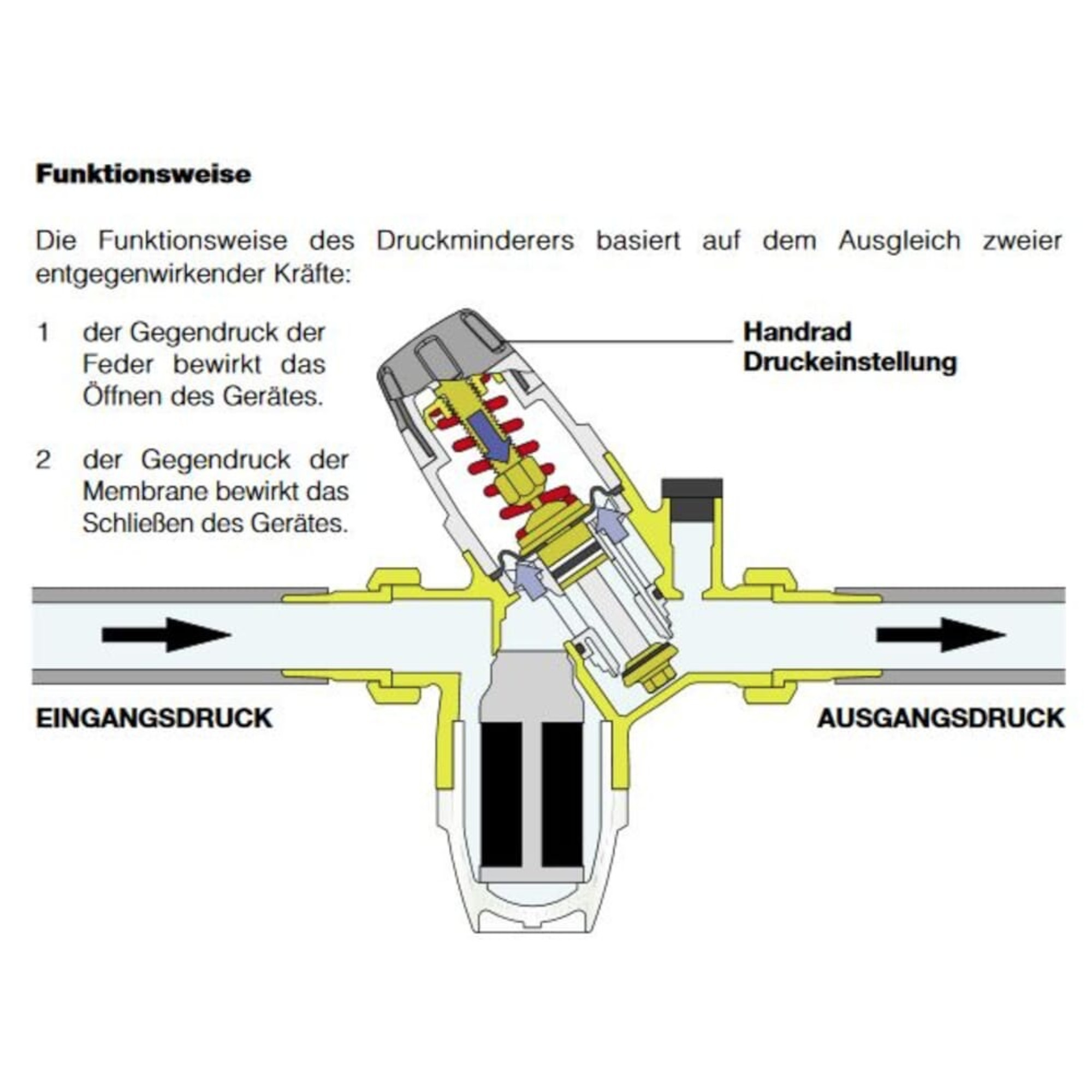 - Druckminderer werden u.a. in Hauswassernetze eingebaut. Sie reduzieren und stabilisieren den Eingangsdruck des Versorgungsnetzes, der zu hoch und zu schwankend für den Gebrauch im Haushalt sein kann.